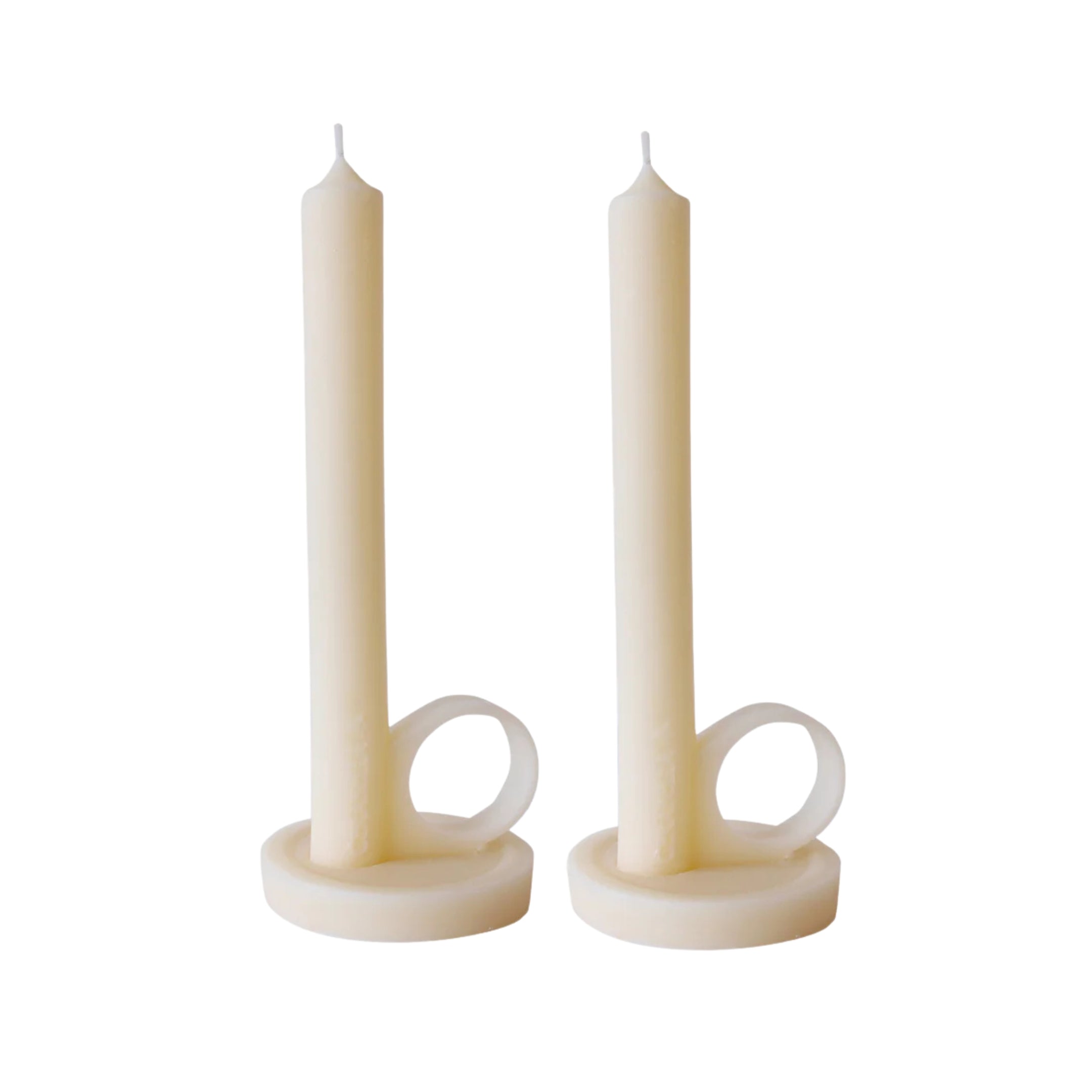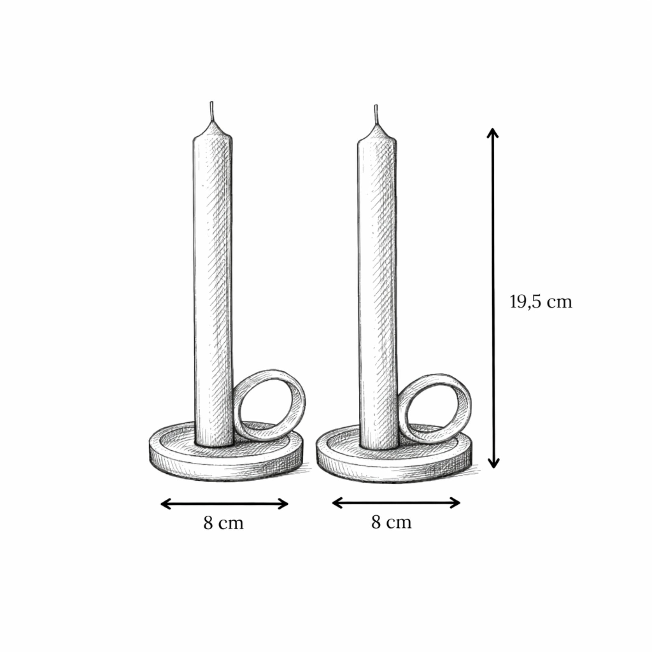 Un set de dos velas donde la forma es la protagonista. La base incorpora un asa circular que aporta carácter y convierte cada pieza en un pequeño objeto decorativo.
