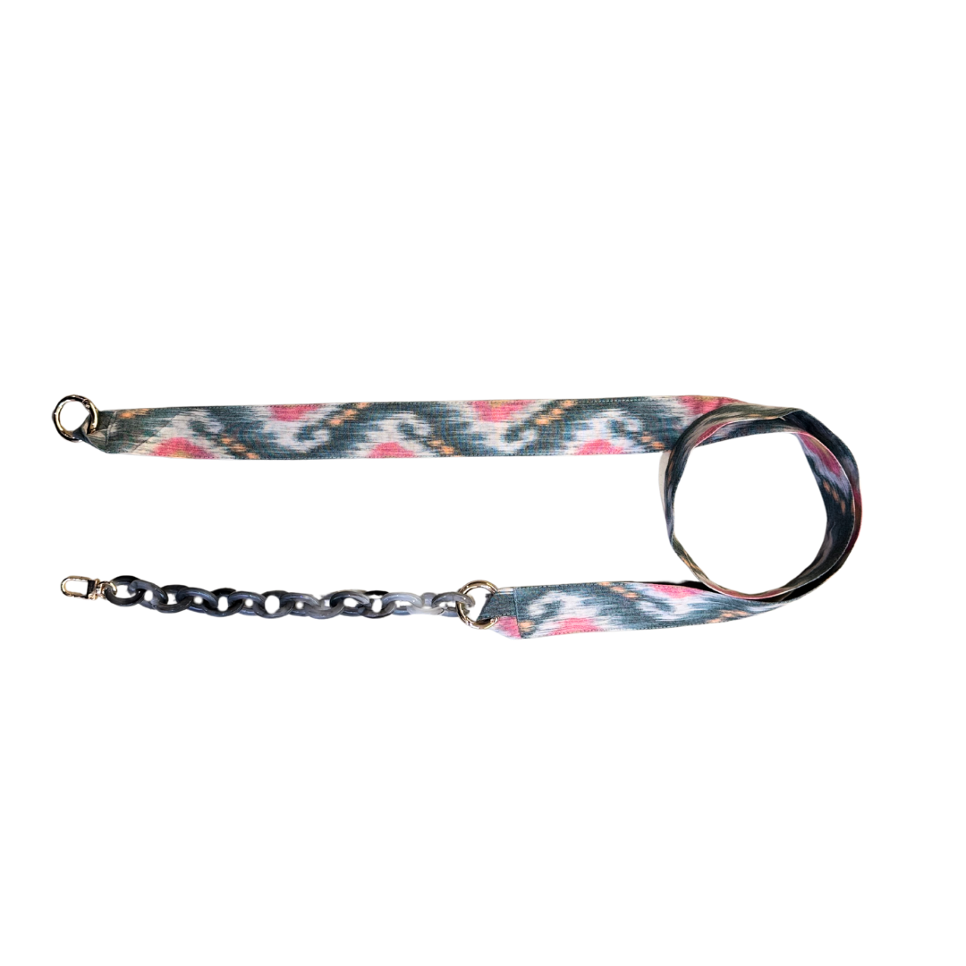 Strap made of cotton and bamboo fabric, with handcrafted diamond patterns in shades of grayish green, off-white, and soft coral, with small mustard accents. A warm and distinctive design that enhances any bag with a natural and special touch.